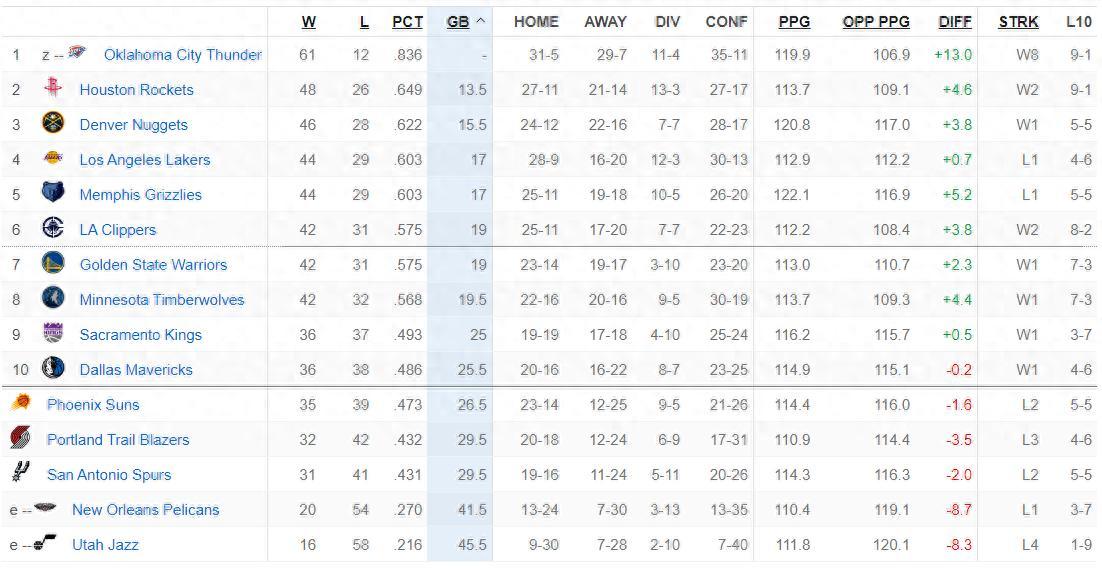北京時間3月29日,NBA常規賽只有4場比賽跟西部排名有關:快船132-100籃網、勇士111-95鵜鶘、森林狼124-109太陽,掘金129-93狂勝爵士,這四場比賽完結後西部的排名沒有任何的變化,只是勝場上有改變。