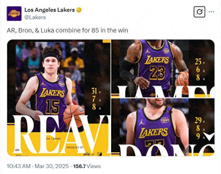 北京時間3月30日,湖人擊敗灰熊賽後,湖人官方盛讚了三位巨頭——勒布朗-詹姆斯、奧斯汀-裏夫斯、盧卡-東契奇。依靠這三人合力85分艱難拿到客場勝利,湖人本賽季面對孟菲斯也來到3勝1負。