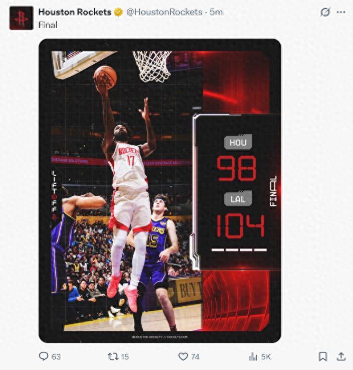 北京時間4月1日,火箭以97-104被湖人逆轉。火箭吞下第27敗,也無緣提前鎖定季後賽。縱觀這場比賽火箭出現11次失誤,而且在決勝時刻是連續犯錯,伊森隔扣芬尼後的怒吼喫T是本場的一個轉折點,當然全隊6人都需要背鍋。