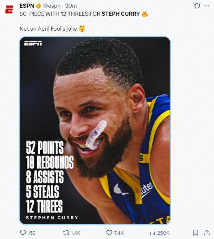 斯蒂芬-庫裏全場比賽拿到52分10籃板8助攻5搶斷1蓋帽12個三分球,ESPN:這不是愚人節的玩笑,庫裏打出了本賽季至今最恐怖的一場比賽,這場比賽讓他的三分命中率提升了0.6%,場均得分提升了0.4分。