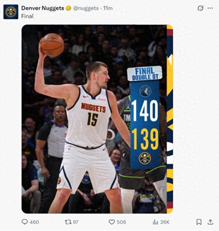 尼古拉-約基奇狂轟61分10籃板10助攻鏖戰雙加時還是輸了,最終輸1分,本賽季掘金被森林狼四殺,這場比賽可以說約基奇的統治力達到巔峯,全場罰球24個,森林狼全隊才25個,這樣的比賽都輸了?拉塞爾-威斯布魯克必須負全責。