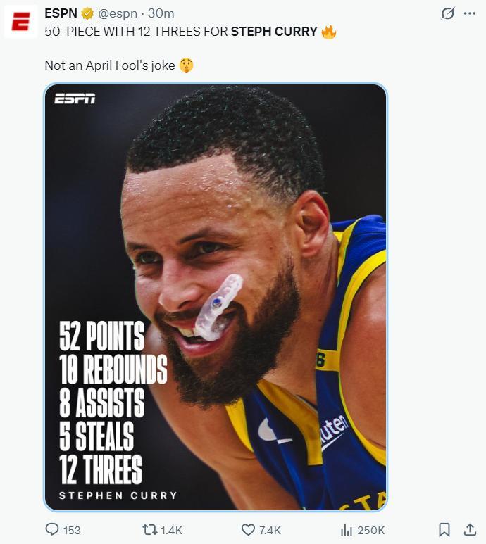 庫裏全場比賽52分10籃板8助攻5搶斷1蓋帽,幫助勇士卡位戰擊敗灰熊,這場比賽是一場當兩場用,勇士44勝31負反超灰熊44勝32負升西部第五,灰熊掉至西部第六,如果按照這個態勢下去,湖人與勇士將在首輪相遇。