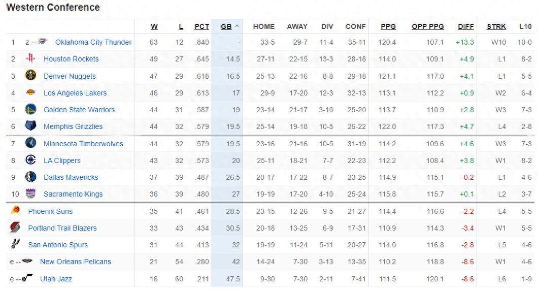 西部最新排名:雷霆、火箭、掘金、湖人、勇士、灰熊、森林狼、快船、獨行俠、國王、太陽、開拓者、馬刺、鵜鶘、爵士。