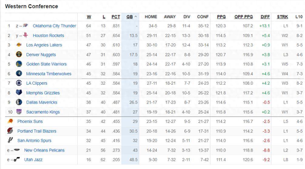 最新的西部排名:雷霆(鎖定季後賽)、火箭(鎖定季後賽)、湖人、掘金、勇士、森林狼、快船、灰熊、獨行俠、國王、太陽、開拓者、馬刺、鵜鶘、爵士。