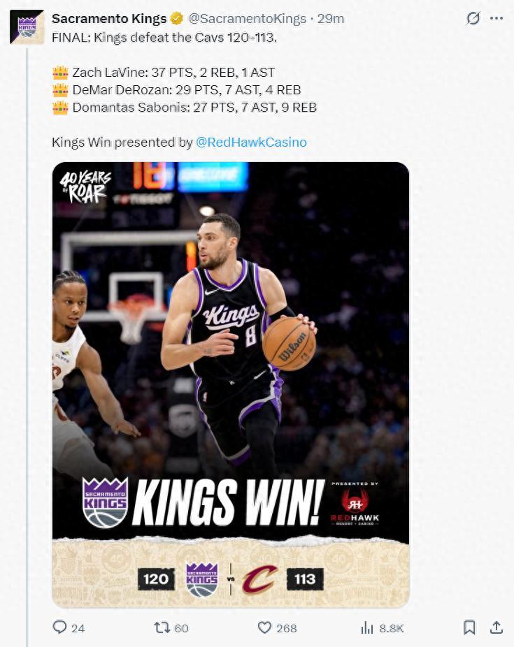 拉文全場比賽42分鐘,21中15+三分11中7拿到37分2籃板1助攻;德羅贊全場比賽40分鐘,18中10+三分5中2拿到28分7助攻4籃板;小薩40分鐘,15中11+三分2中1拿到27分9籃板7助攻,國王三巨頭合計拿到92分15助攻15籃板,國王三巨頭太出色了。