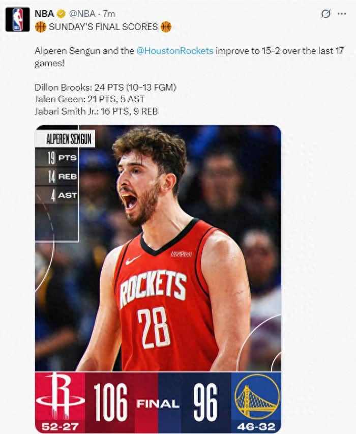 休媒Bradeaux寫道:火箭隊過去17場比賽贏下其中15場,他們距離鎖定西部第二隻差1個勝場。