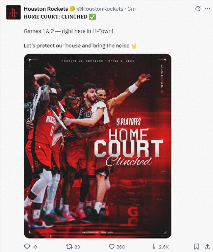 北京時間4月7日,火箭以106-96擊敗勇士拿到三連勝,此役後火箭鎖定西部前四的席位,火箭官方曬出海報慶祝,這場比賽防守制勝,申京在這場比賽中發揮了極其重要的作用,他製造追夢技術犯規+一級惡意犯規,讓勇士最能激勵全隊的那個人無法挺身而出,火箭官方慶祝已經鎖定西部前四手握季後賽主場優勢。