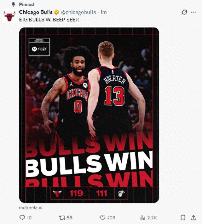 北京時間4月10日,公牛以119-111逆轉熱火。這場比賽後公牛已經穩住東部第九的席位,還與熱火拉開1個勝場,而且公牛與東部第七的老鷹只差0.5場,公牛還有希望去衝擊一個附加賽上半區的席位。