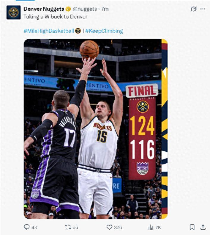 這場比賽後掘金結束了四連敗,拿到48勝32負因爲跟快船相比VS西部戰績更優異,所以掘金升西部第四,快船掉西部第五。