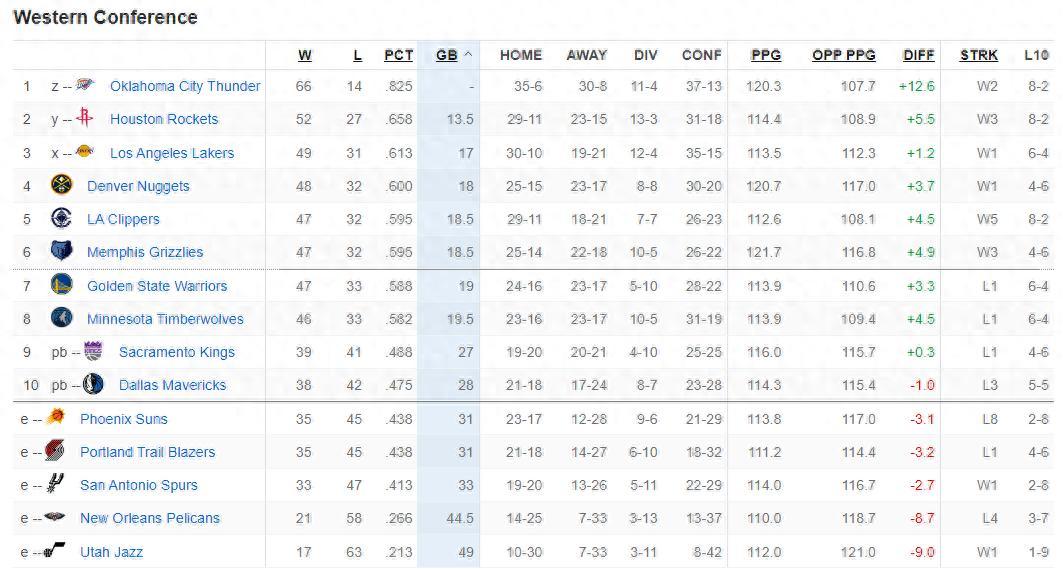 西部最新排名:雷霆、火箭、湖人(都鎖定季後賽);掘金、快船、灰熊、勇士、森林狼、國王、獨行俠、太陽(無緣附加賽)、開拓者、鵜鶘、爵士。
