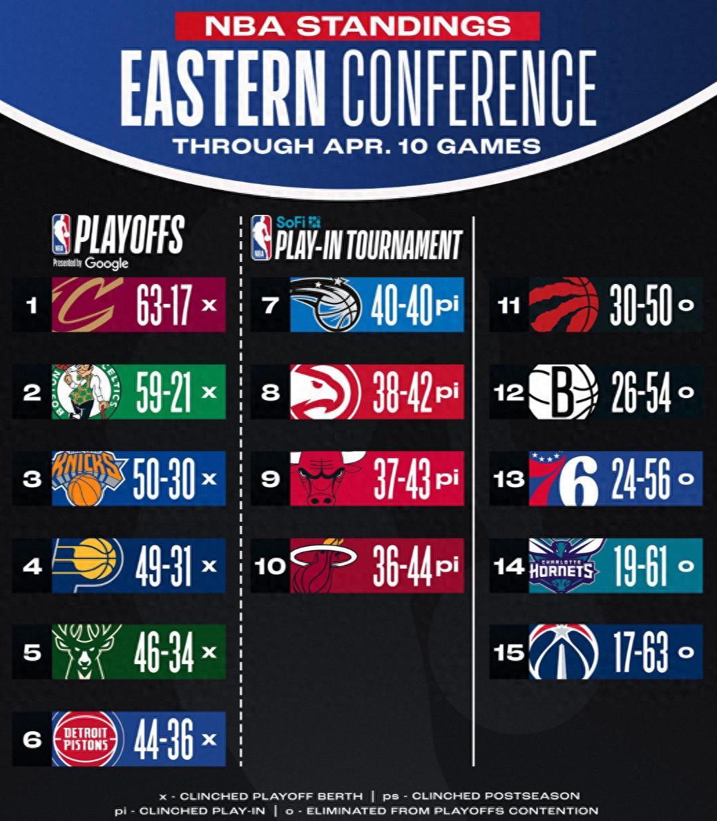 跟西部的大亂鬥比起來,東部明顯要“冷清”的多,因爲騎士、凱爾特人、尼克斯、步行者已經鎖定了前四,騎士、凱爾特人、尼克斯、步行者、雄鹿、活塞已經鎖定前六,附加賽的四隊已經確定是魔術、老鷹、公牛、熱火。