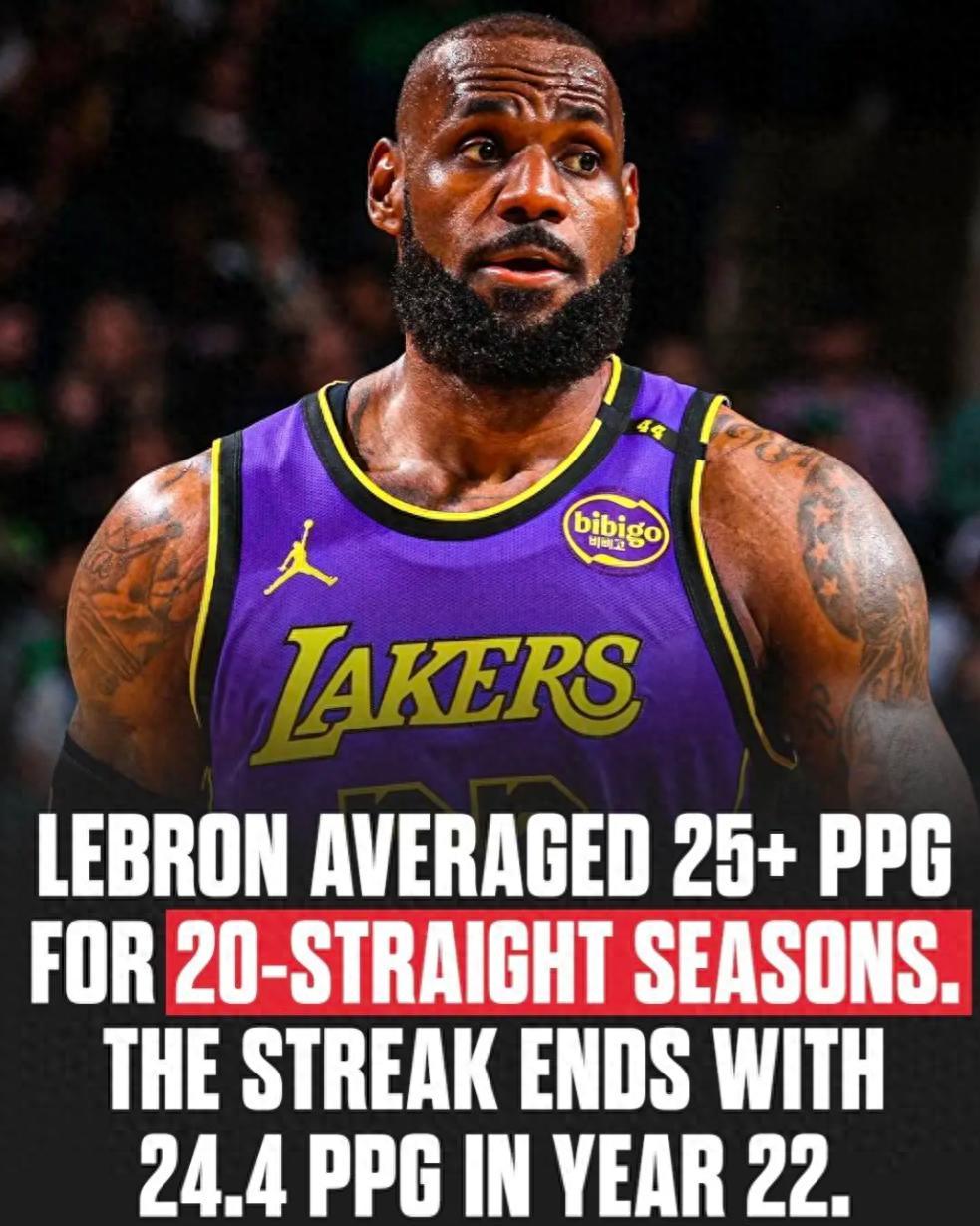 湖人媒體曬出詹姆斯職業生涯22年的場均得分,他寫道這一波的紀錄中斷了(心碎)。實際上40歲的勒布朗能場均24.4分也已經是歷史首人,這是他的22個賽季啊。