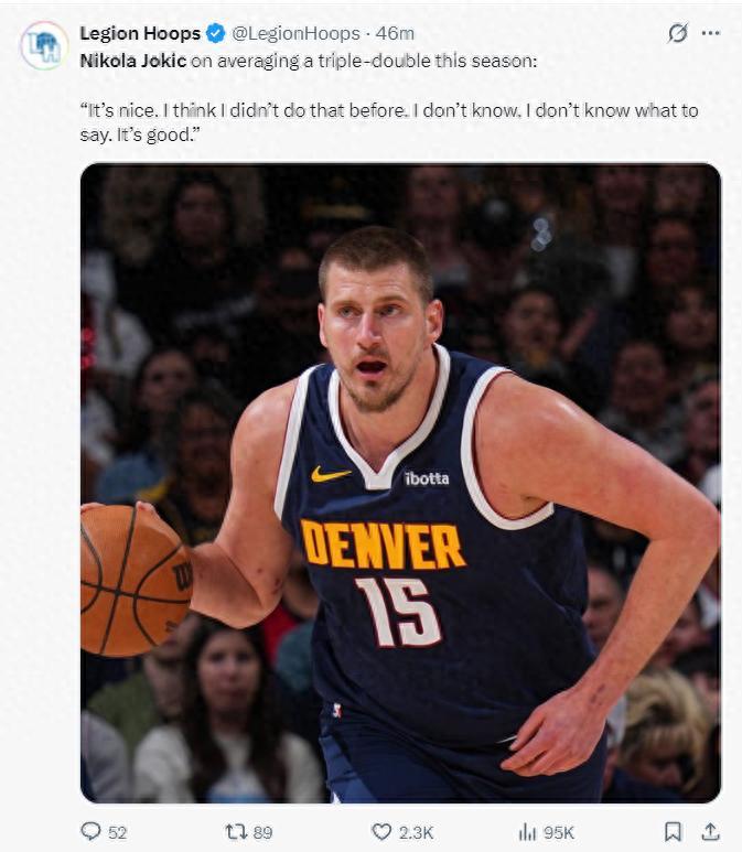 北京時間4月13日晚,掘金球星尼古拉-約基奇接受採訪,記者詢問他怎麼看待自己已經達成場均三雙,約基奇回答:“挺好,我之前沒有做到過,你現在硬要問我什麼感覺,我只能說挺不錯的。”