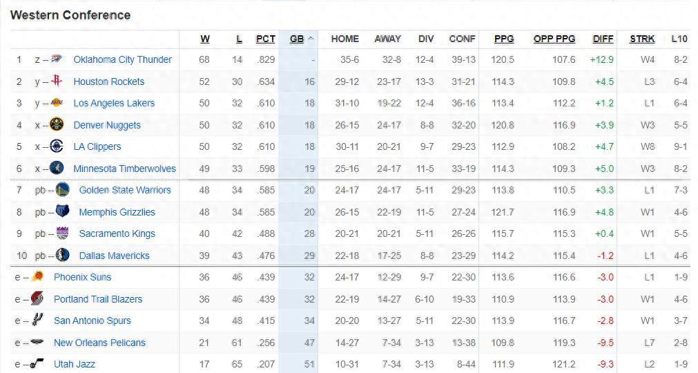 北京時間4月14日,NBA常規賽收官,掘金大勝火箭鎖定第四,灰熊大勝獨行俠幫助國王鎖定第九(國王大勝太陽),森林狼大勝爵士升至第六,勇士惜敗快船後掉第七要打附加賽(灰熊VS勇士)。