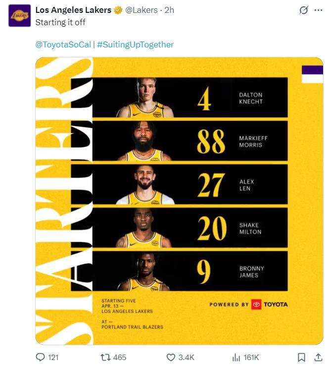 末節,克內克特突破再度得手,布朗尼也完成本場比賽第二個運動戰,克內克特外線超遠三分命中,他成爲此役湖人最大的亮點了,布朗尼都已經不敢出手因爲他效率太差,克內克特末節7分。
