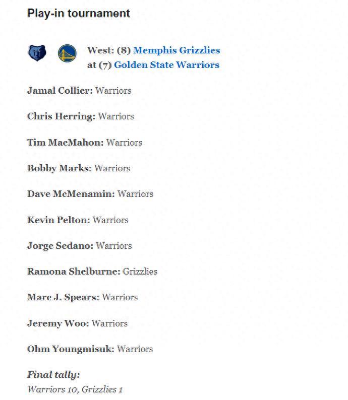 北京時間4月15日,ESPN11位專家預測勇士VS灰熊附加賽的賽果,有10位專家都看好是勇士贏球,只有蕾夢娜-謝爾伯恩覺得灰熊贏,換言之就是10位專家認可勇士最終西部第七。