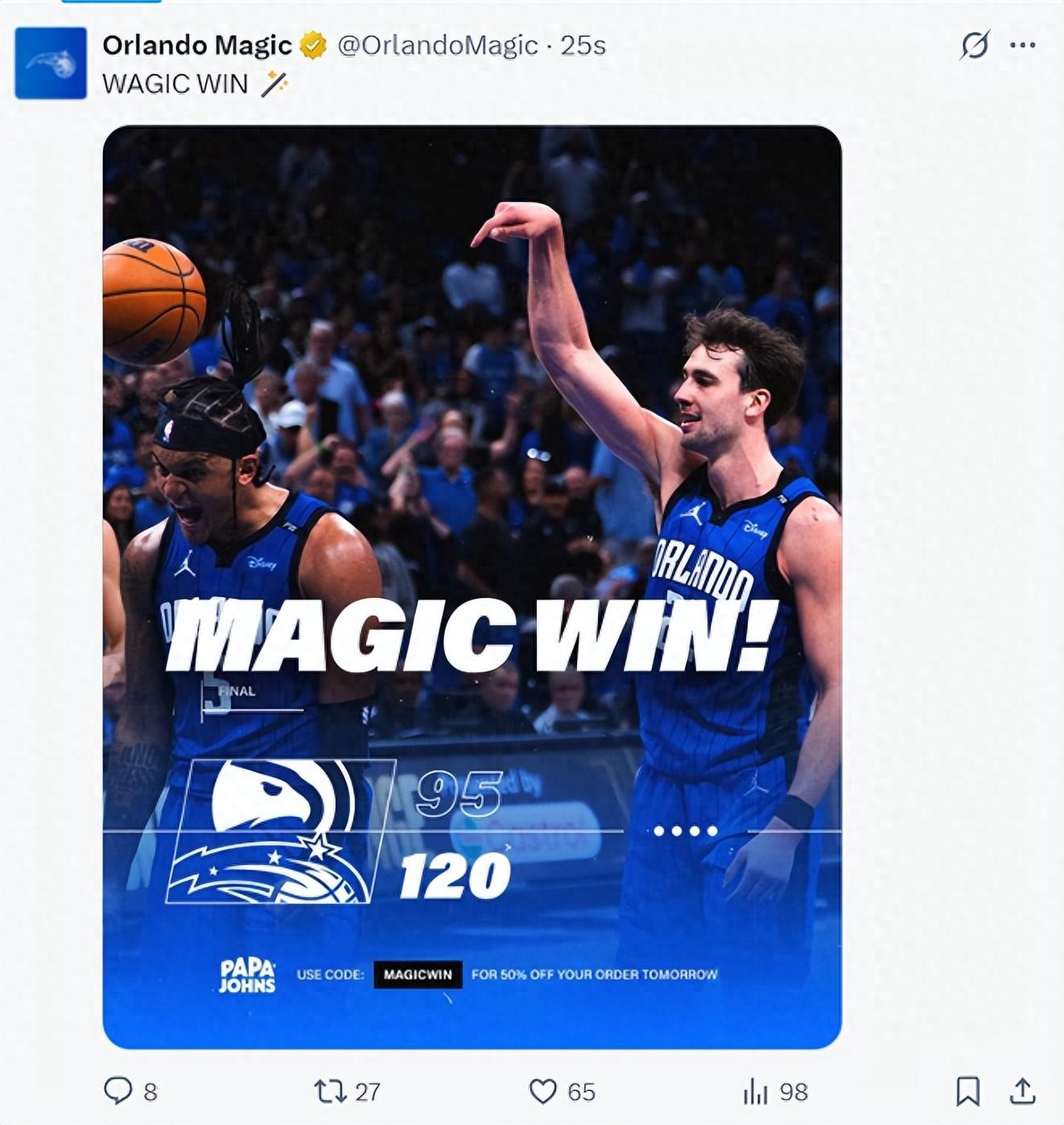 魔術官方曬出科爾-安東尼20分鐘,17中10,三分9中4,拿到26分5助攻3籃板,正負值+32,他在末節的發揮至關重要。