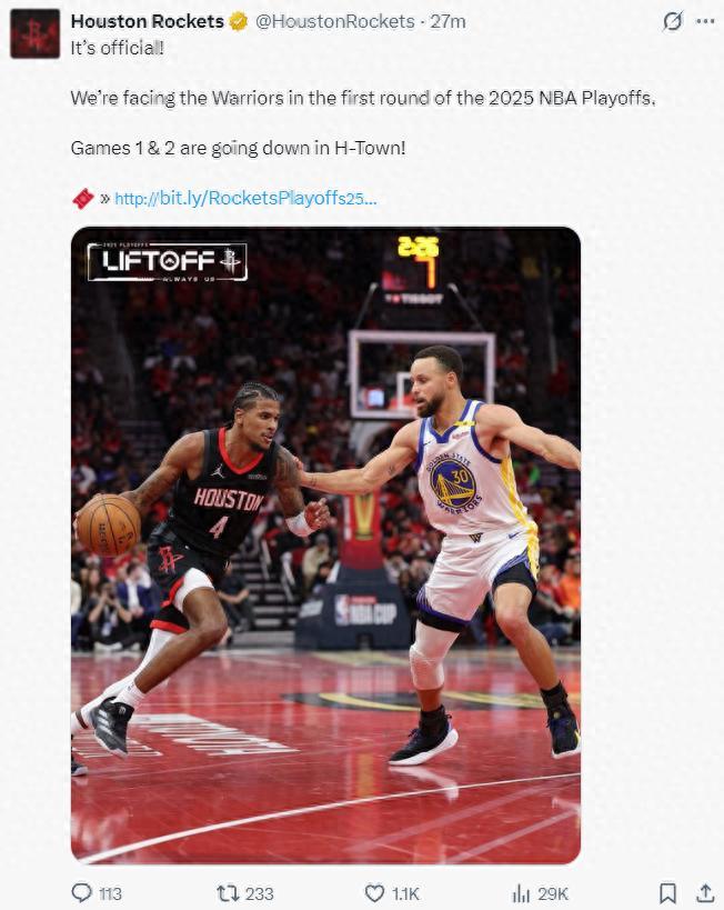 火箭官方也曬出了賽程——4月20日、4月23日(火箭主場);4月26日、4月28日(勇士主場)。