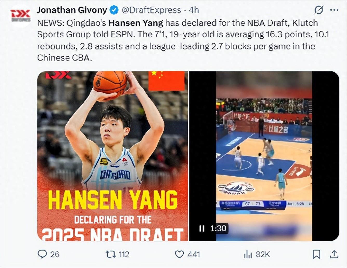 北京時間4月17日,根據ESPN選秀專家喬納森-基沃尼的報道,CBA青島男籃球員楊瀚森已經宣佈參選NBA,楊瀚森的經紀公司Klutch 體育向ESPN透露這個消息。楊瀚森身高7尺1,年僅19歲的他在CBA場均16.3分10.1籃板2.8助攻2.7蓋帽。