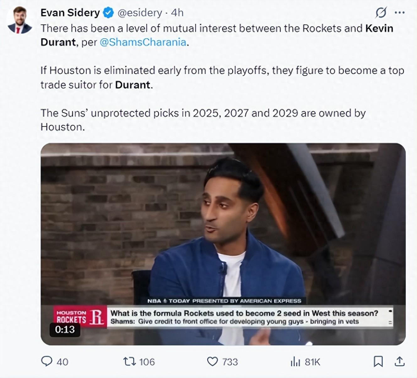 北京時間4月17日,EPNS名記Shams透露,火箭與杜蘭特雙方都有一定程度上的合作意願。前提是火箭在季後賽早早出局,如果火箭在季後賽走的挺遠得到了管理層的預期那麼他們會 保留現有陣容,如果沒有達到預期就會嘗試與KD合作。