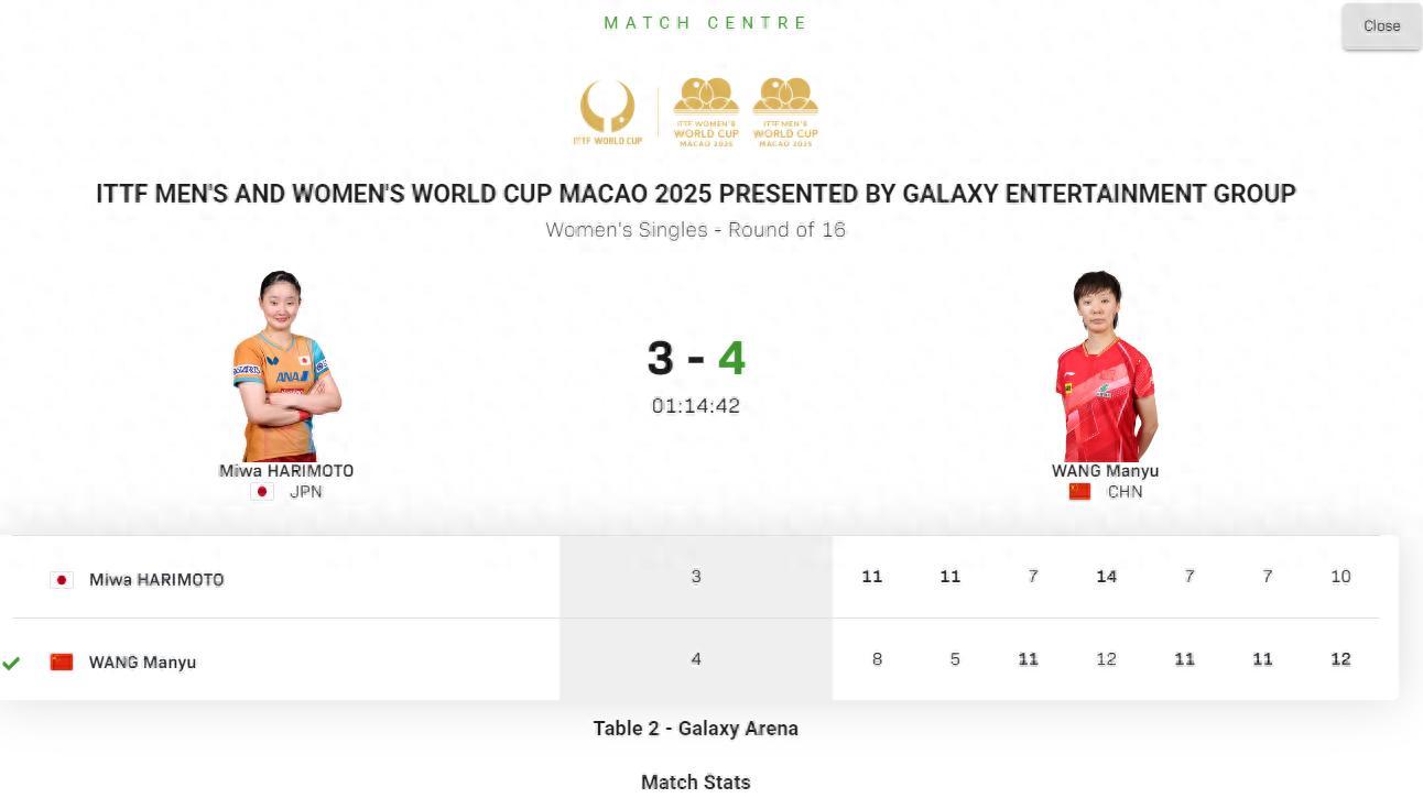 北京時間4月17日,乒乓球澳門世界盃女單1/8決賽,國乒選手王曼昱以4-3逆轉日乒選手張本美和,七局比分:8-11、5-11、11-7、12-14、11-7、11-7、12-10。這是全世界最高水準的較量,王曼昱世界第二,張本美和世界第五。