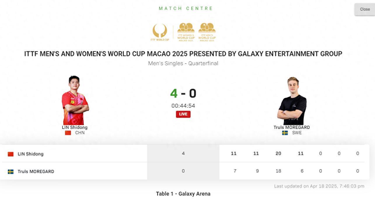 北京時間4月18日,乒乓球世界盃男單1/4決賽,林詩棟4-0擊敗莫雷高德,下一輪的對手是梁靖崑,四局比分:11-7、11-9、20-18、11-6。