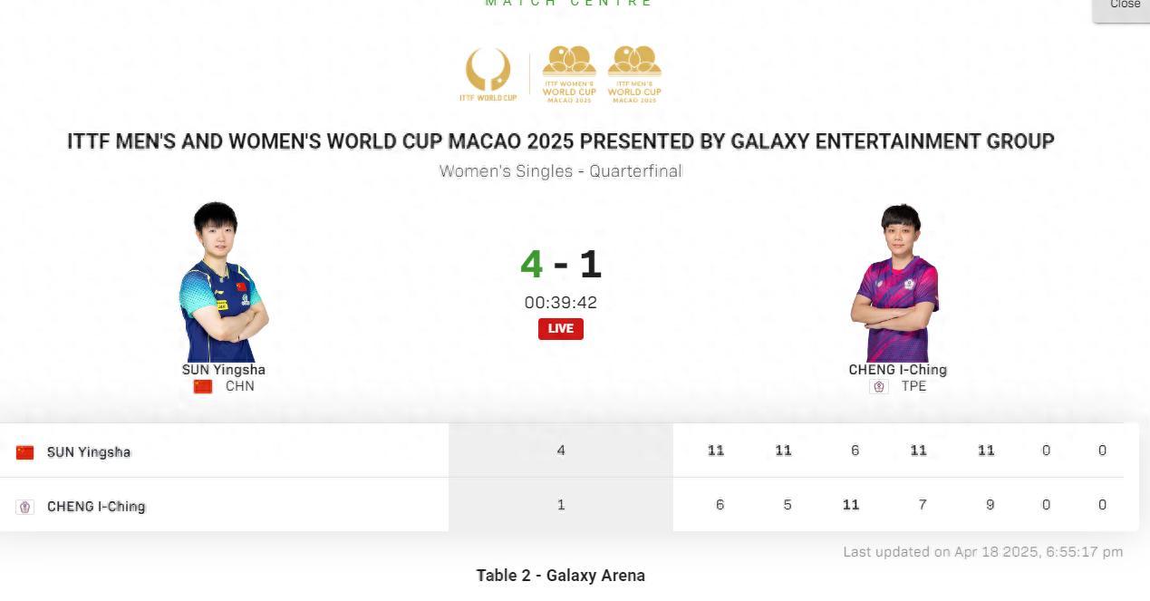 北京時間4月18日,乒乓球世界盃女單1/4決賽,孫穎莎4-1擊敗鄭怡靜晉級四強,下一輪孫穎莎的對手陳幸同。五局比分:11-6、11-5、6-11、11-7、11-9。