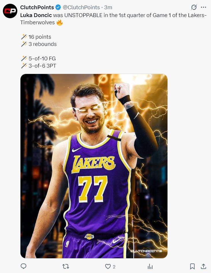 末節開場東契奇三分又中,東契奇再度點名裏德命中,東契奇被華子連續點名兩個都進了,森林狼再度拉開到16分。東契奇6分鐘回來打最後階段,但森林狼直接將分差拉開到21分,湖人球迷們開始退場。