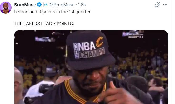首節湖人三分球12中7太準了,八村兩個,芬尼史密斯與文森特1個,東契奇三個,詹姆斯打了7分鐘55秒2中0,數據是0分0籃板0助攻1搶斷,東契奇首節拿到16分,40歲的老漢安心划水,而且劃的特別開心。湖媒:勒布朗0分湖人都領先7分,勒布朗要哭了。