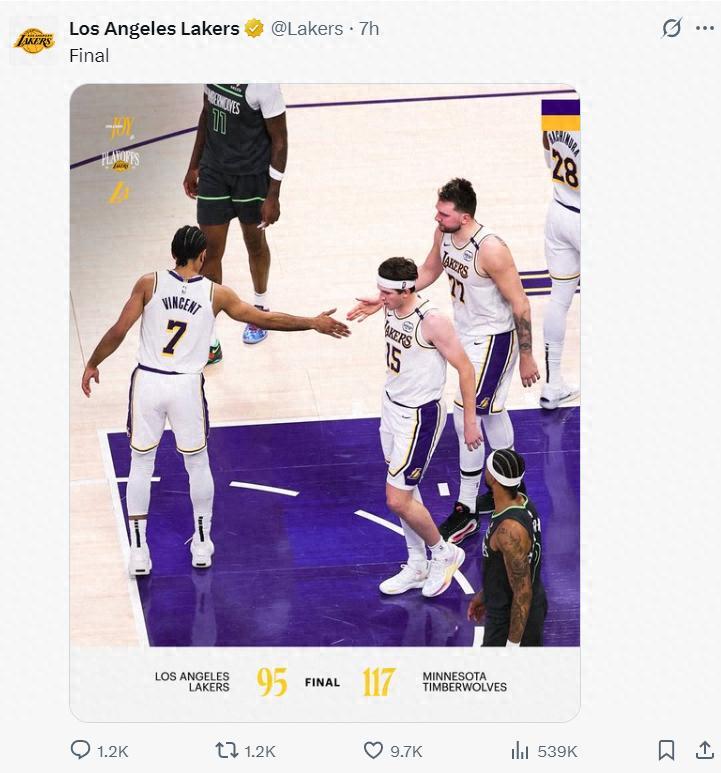 湖人95-117慘敗森林狼,在首節領先的情況下第二節崩盤,湖人成爲本賽季第一支身處上半區率先輸球的球隊,西部三號種子面對西部第六毫無還手之力,湖人的內線軟肋盡顯無疑。
