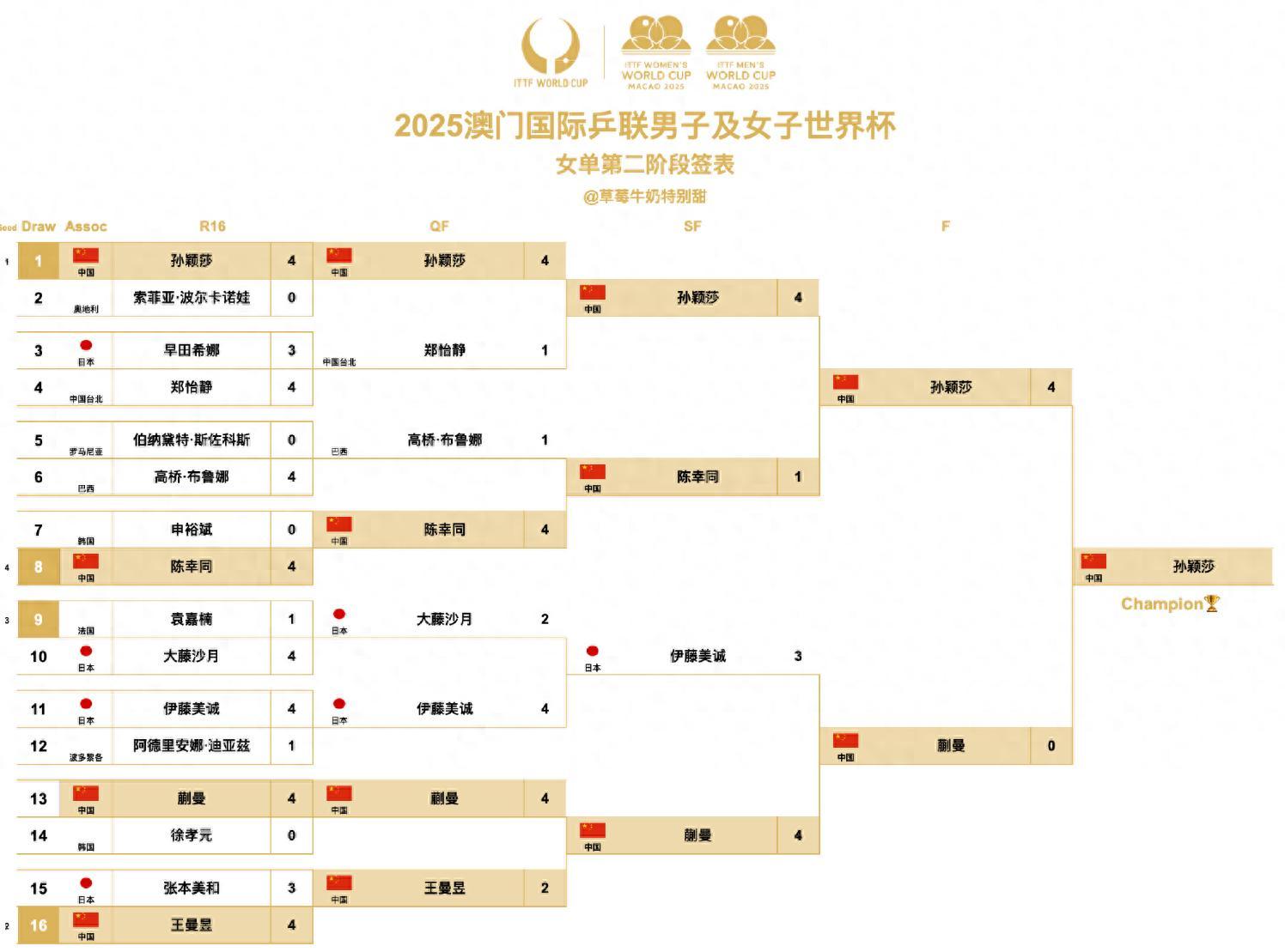 北京時間4月20日,澳門世界盃女單決賽打完,孫穎莎4-0橫掃蒯曼衛冕成功,孫穎莎拿到個人生涯第三個三大賽冠軍,她只差一個奧運會女單冠軍就實現大滿貫,而21歲的小將蒯曼首次進入世界盃就拿到亞軍。(孫穎莎2020年首次世界盃之旅也是亞軍)