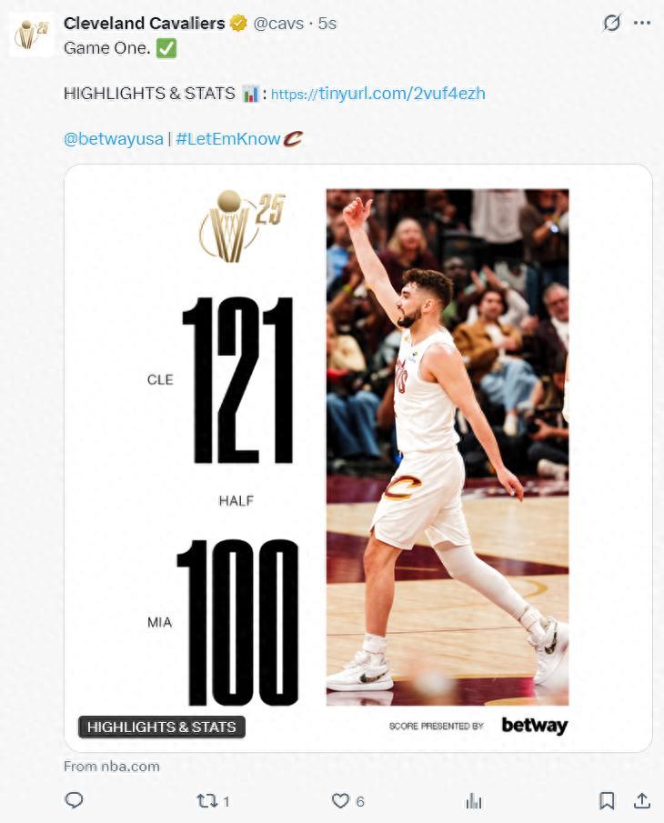 北京時間4月21日,騎士以121-100擊敗熱火,大比分1-0領先。這場比賽是超六候選人泰-傑羅姆季後賽生涯之夜,這是他職業生涯首次參與季後賽,他末節16分引全場歡呼,全場比賽26分鐘拿28分成爲1971年以來的第四人。