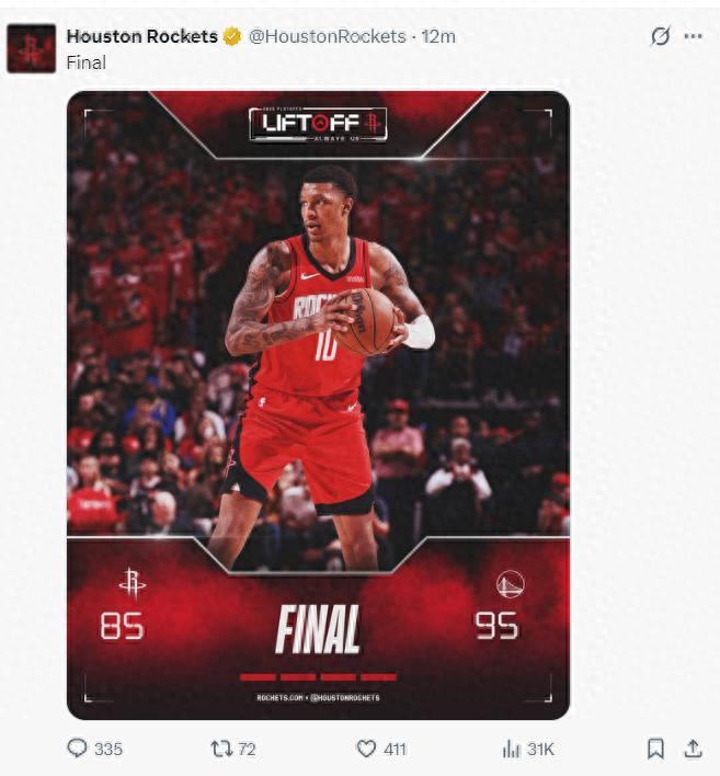 上半場打完杰倫-格林7中1+三分2中0,拿2分,美媒HC調侃:“杰倫-格林是火箭的最佳球員。”