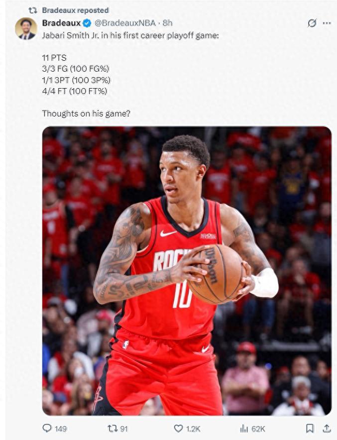 休媒BiasedHouston表示:小賈對陣勇士的比賽太出色了,爲什麼在決勝時刻要將他換下?如果是我的話我會換下一個後衛範弗利特/格林其中一個被換下,讓小賈+申京繼續待在場上。