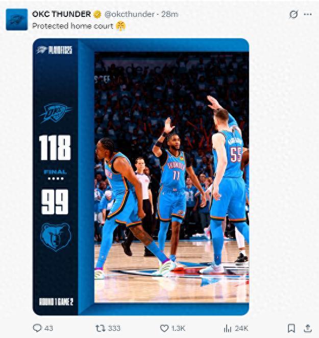 北京時間4月23日,NBA季後賽,俄克拉荷馬雷霆以118-99大勝孟菲斯灰熊,大比分2-0領先。首節雷霆領先15分,半場打完領先到18分,第三節打完灰熊縮小到11分,可末節灰熊再度將分差拉開早早失去懸念。