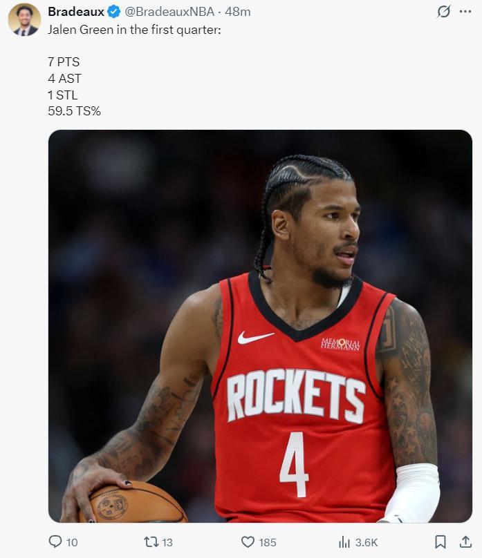 杰倫-格林在G1的發揮很差,15中3,三分4中0,拿7分8籃板2助攻1失誤,命中率20%結束了生涯首場季後賽。這場G2所有人都在盯着他,因爲已經有美媒覺得這個系列賽決定格林今夏的去留問題,格林也在個人IG上發聲來打破質疑,首節他5中2+三分4中1拿到7分1籃板4助攻1搶斷。