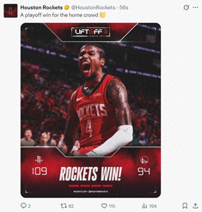 這場比賽是火箭最近季後賽與勇士第20次交手,火箭是17負3勝。也是勇士隊與火箭隊季後賽第25次交手,火箭的第八場勝利,也算是終結兩大魔咒的一場關鍵戰役。