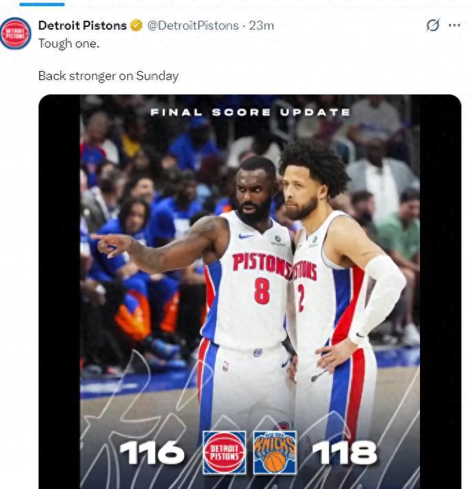北京時間4月25日,活塞以116-118不敵尼克斯,大比分1-2落後。這場比賽小哈達威大爆發,一度三分6中6,最終三分12中7,在末節決勝時刻搶中了一個三分,但布倫森的回場違例裁判沒有吹罰, 活塞錯過了絕平的機會,布倫森的回場引發熱議。