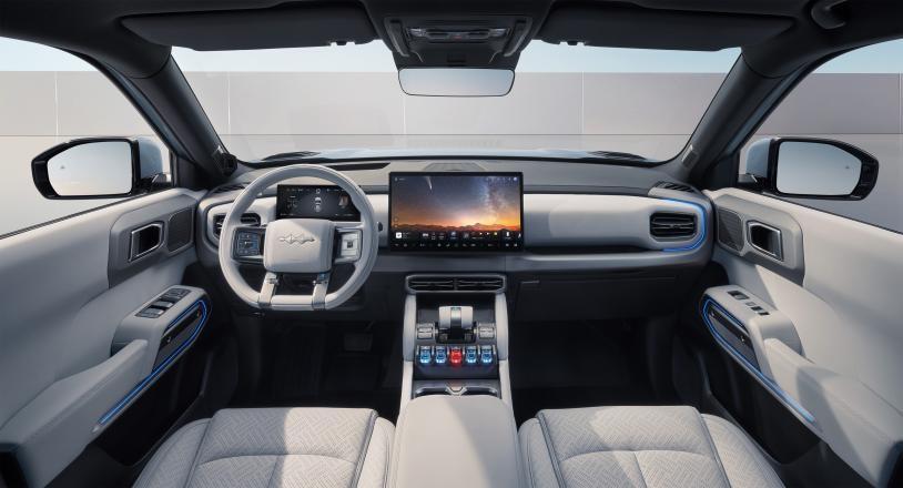 座艙內,飛翼式儀表臺、C形星際氛圍燈與豹系家族同款的“戰車檔把+水晶按鍵”,構建出極具科幻力的駕駛氛圍;AI智能座艙與多功能靈動島,支持語音交互、場景模式一鍵切換,15.6英寸中控屏、12英寸HUD與帝瓦雷音響,搭配人體工學座椅與冷暖冰箱,讓每一程都沉浸於舒適與潮流樂趣中。
