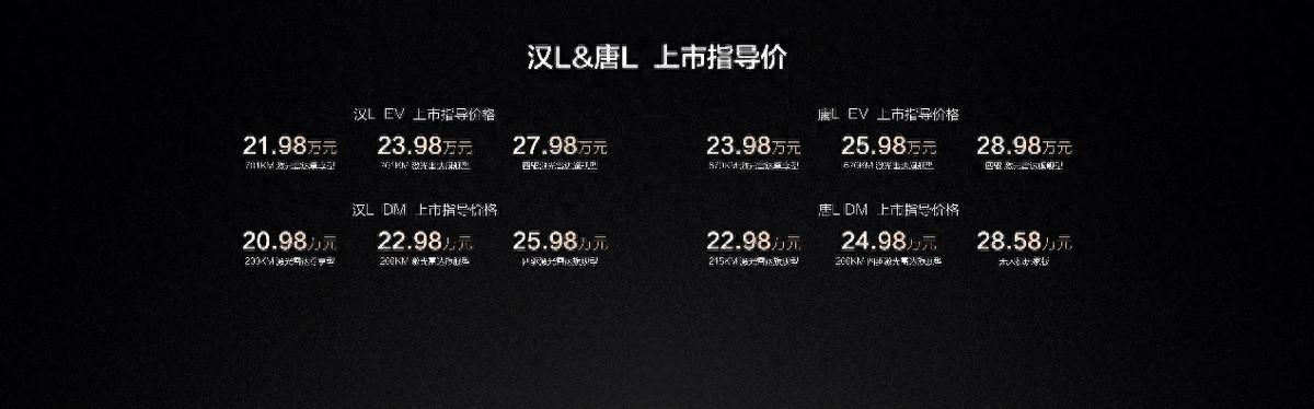 4月9日,比亞迪劃時代旗艦轎車漢L正式上市,共推出漢L EV、漢L DM兩大車系。新車長寬高分別爲5050*1960*1505mm,軸距2970mm,是標準的C+級轎車。其中,漢L EV坐擁701KM激光雷達尊享型、701KM激光雷達旗艦型、四驅激光雷達旗艦型;漢L DM坐擁200KM激光雷達尊享型、200KM激光雷達旗艦型、四驅激光雷達旗艦型。新車提供4種外觀顏色及2種內飾配色,售價爲20.98萬~27.98萬元。