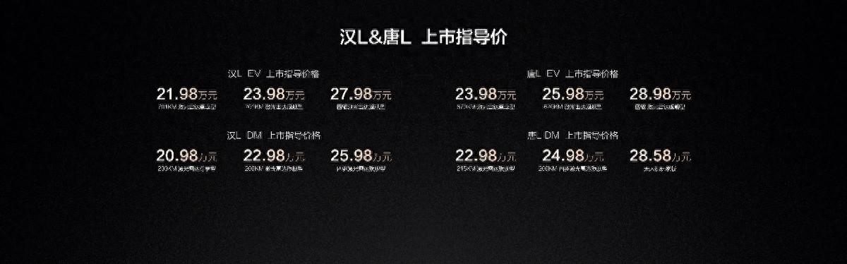 4月9日,比亞迪劃時代旗艦SUV唐L正式上市,共推出唐L DM、唐L EV兩大車系。新車長寬高分別爲5040*1996*1760mm,軸距2950mm,是標準的C+級SUV。其中,唐L DM坐擁215KM激光雷達旗艦型、200KM四驅激光雷達旗艦型、無人機玩家版;唐L EV坐擁670KM激光雷達尊享型、670KM激光雷達旗艦型、四驅激光雷達旗艦型。新車提供4種外觀顏色及2種內飾配色,售價爲22.98萬~28.98萬元。