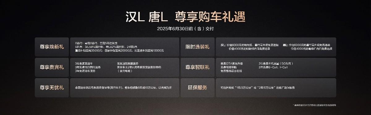 伴隨唐L的上市,比亞迪王朝網還準備了七重購車禮遇。截至6月30日24:00前完成購車開票,用戶可享尊享金融禮,0首付、0利息任選其一;尊享置換禮,置換補貼至高35000元;還有尊享無憂禮、尊享貴賓禮、尊享智聯禮、延保服務可選。其中,尊享置換禮中除了至高20000元國補,更有首銷期限時置換補貼10000元,同時比亞迪老車主額外可享5000元置換補貼加碼!此外,用戶額外可享限時選裝禮,包括價值6000元的墨竹青外觀免費選裝、價值4000元的霞緋紅內飾免費選裝。尊享購車禮遇加持,進一步降低消費者的購車用車成本,讓更多年輕用戶暢享旗艦級出行體驗。