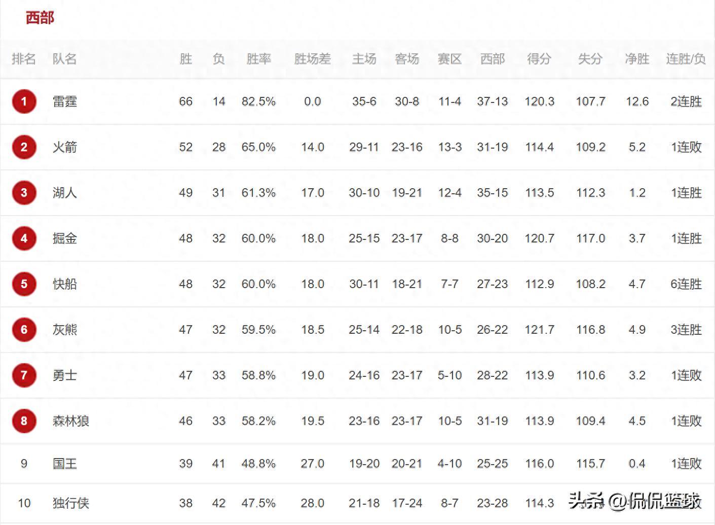 隨着2025年NBA常規賽進入最後一週(截至4月10日),西部季後賽席位的爭奪已進入白熱化階段。雷霆與火箭雖已鎖定前兩名,但剩餘的四個直接晉級名額及附加賽資格的競爭堪稱“地獄級難度”——從第三名掘金到第八名森林狼,六支球隊勝場差僅1.5場,每一場比賽的勝負都可能徹底改寫排名格局。這種近乎“大逃殺”的激烈程度,不僅考驗球隊的球星成色與戰術調整能力,更將人性的博弈與競技體育的殘酷展現得淋漓盡致。