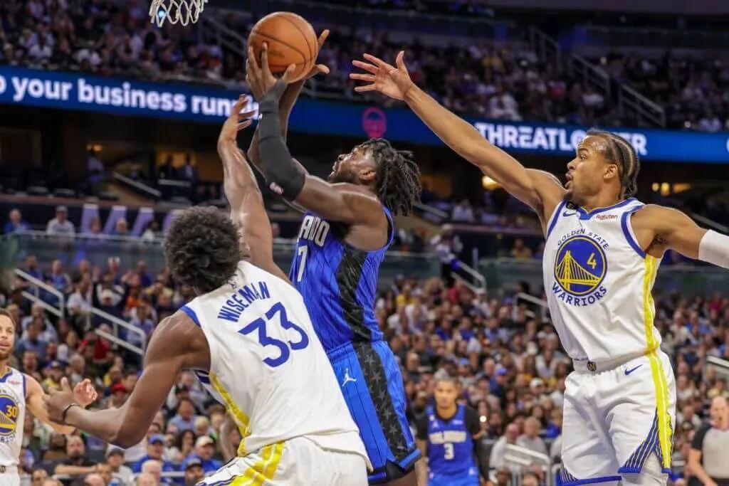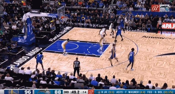 當時,勇士的領先優勢已經縮小到只剩8分,距離第三節結束還有50秒左右的時間,趁此機會完成防守,然後再打成一個進攻回合,將領先優勢擴大到兩位數,這無疑可以讓勇士帶着非常大的心理優勢進入到比賽最後一節的爭奪當中。此時,魔術的丘馬·奧吉吉在側翼出手了一個三分球,三位勇士球員——庫裏、穆迪以及懷斯曼都在三秒區裏準備搶籃板。在NBA的賽場上,這是一個普通到不能再普通的回合。