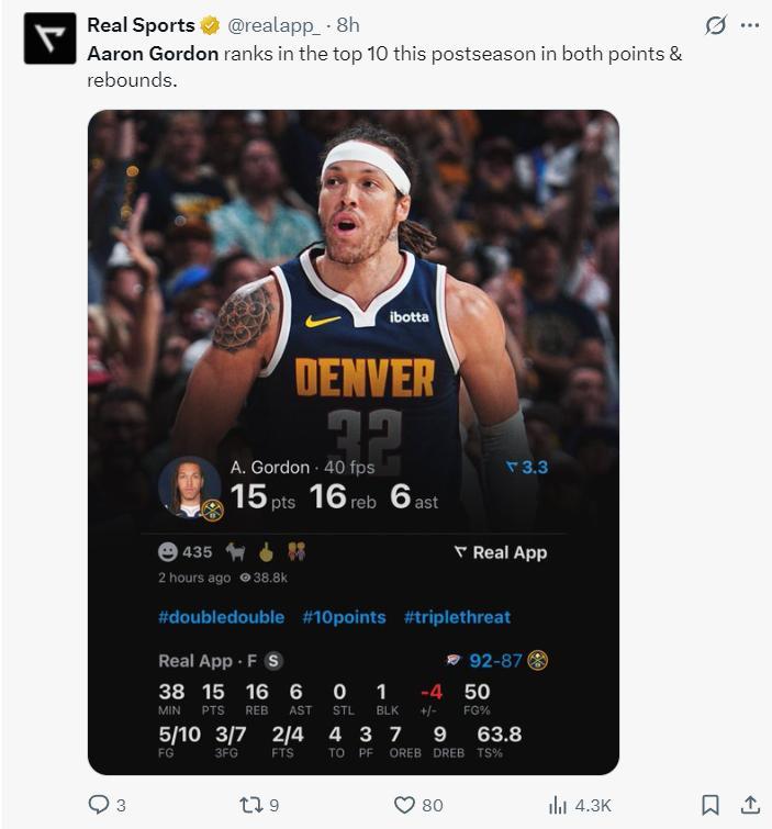 全場比賽戈登38分鐘,10中5,三分7中3,拿到15分16籃板6助攻1蓋帽,命中率50%,三分命中率42.9%,真實命中率63.8%。戈登季後賽得分、籃板都在聯盟前十之內,他真的已經足夠出色。