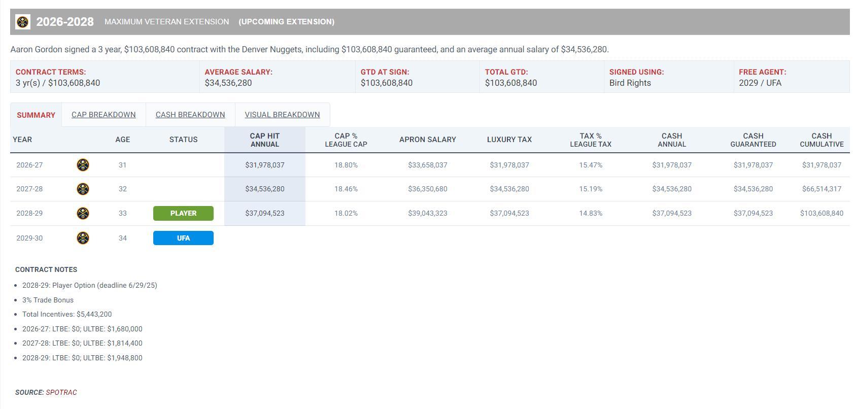 去年夏天掘金跟戈登提前續約三年1.03億,算上25-26賽季的2284萬,也就是未來四年合計1.25億,均薪才3125萬,只能說太超值了。
