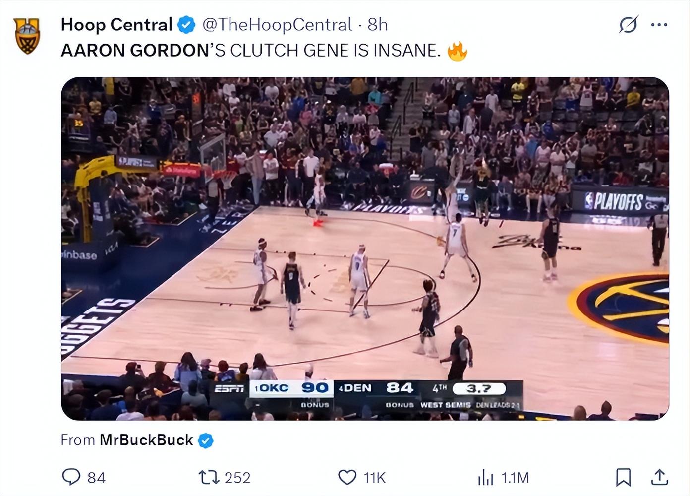 戈登今年季後賽已經多次拯救掘金,0.1秒絕殺快船、三分絕殺雷霆、三分絕平雷霆+加時後仰鎖定勝局。
