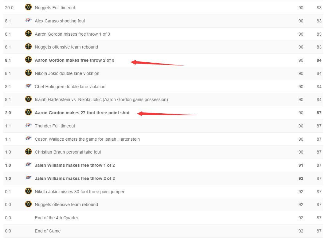 傑威終場前20秒兩罰全中領先7分,這時候感覺掘金都放棄了,只有戈登一人還在拼,戈登突破製造卡魯索犯規兩罰一中。隨後約基奇與霍姆格倫跳球,戈登搶到球后命中了一個三分球。
