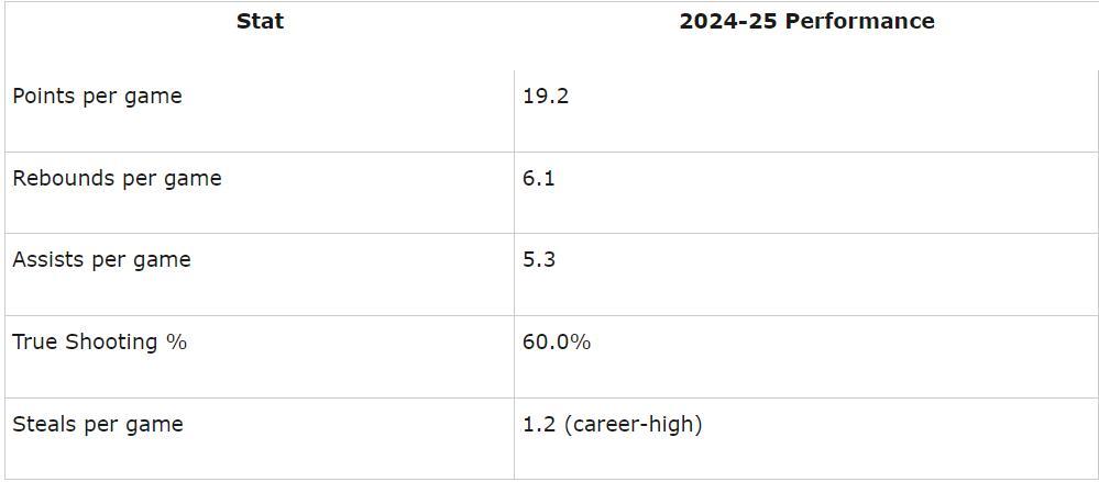 貝恩本賽季場均19.2分6.1籃板5.3助攻1.2搶斷,真實命中率60%,貝恩是一個頂級的3D二號位,他有着最頂級的無球能力,而且他的身體很強壯防守端不喫虧,他最大的問題是五年1.97億的合同。