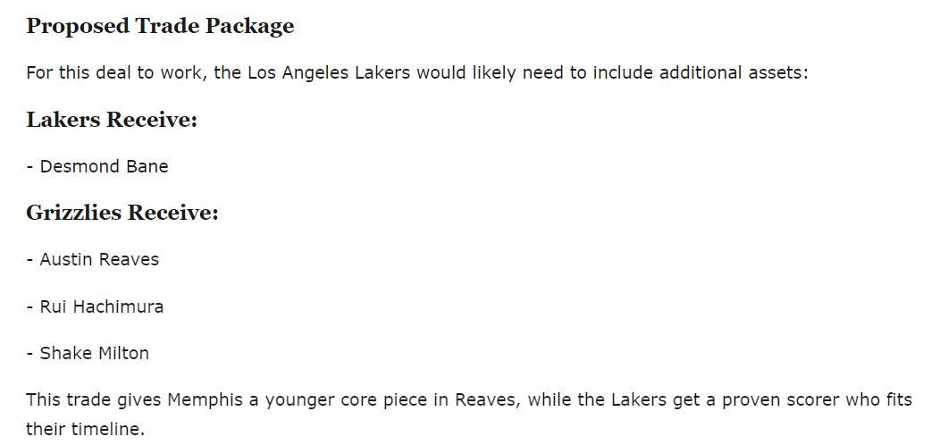 湖人可以用裏夫斯、八村壘、米爾頓爲交易籌碼去換貝恩,一方面爲灰熊減輕未來的薪資負擔,另一方面他們也得到兩個即戰力。